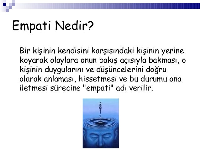 Empati nedir, etkili empatide neler olmalıdır? Empati kurmak, karşısındaki bir kimseyi kendini onun yerine koymasıdır. Insanin karsisindaki gibi düşünüp herhangi bir durumda karsidaki insan ne yapardi sorusunu kendisine sormasi ve o sorunun cevabini yine karsida ki insan gibi bulmasi. Empati kurmak sadece duygu ve düşünceleri anlamaktan geçmez.